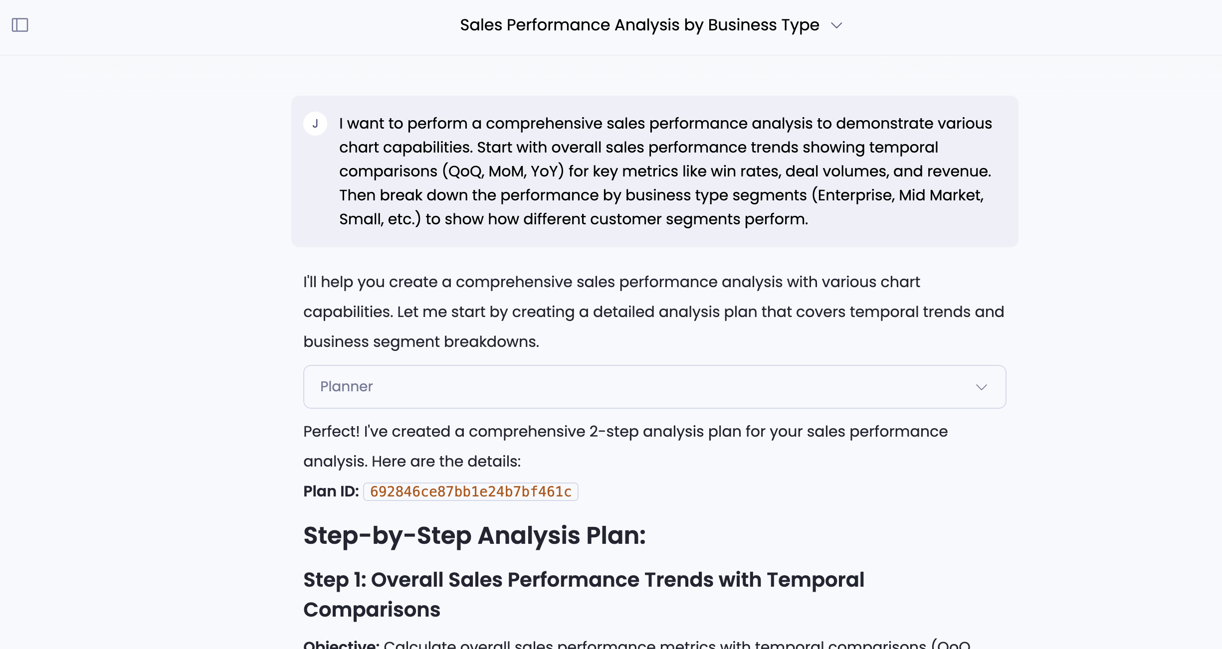 Visualization is always done after an analysis has run. This keeps charting aligned with the plan-first philosophy: first align on definitions, sources, and steps, and only then visualize the output.