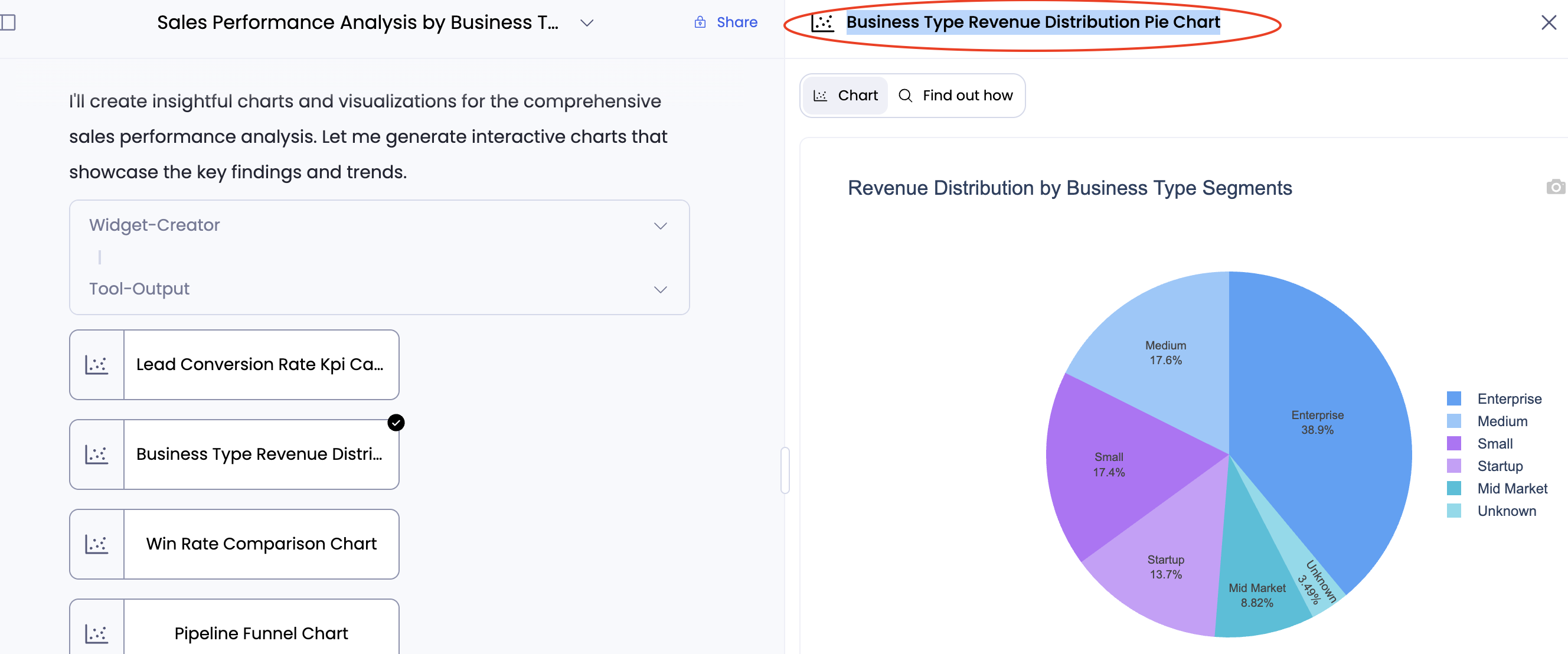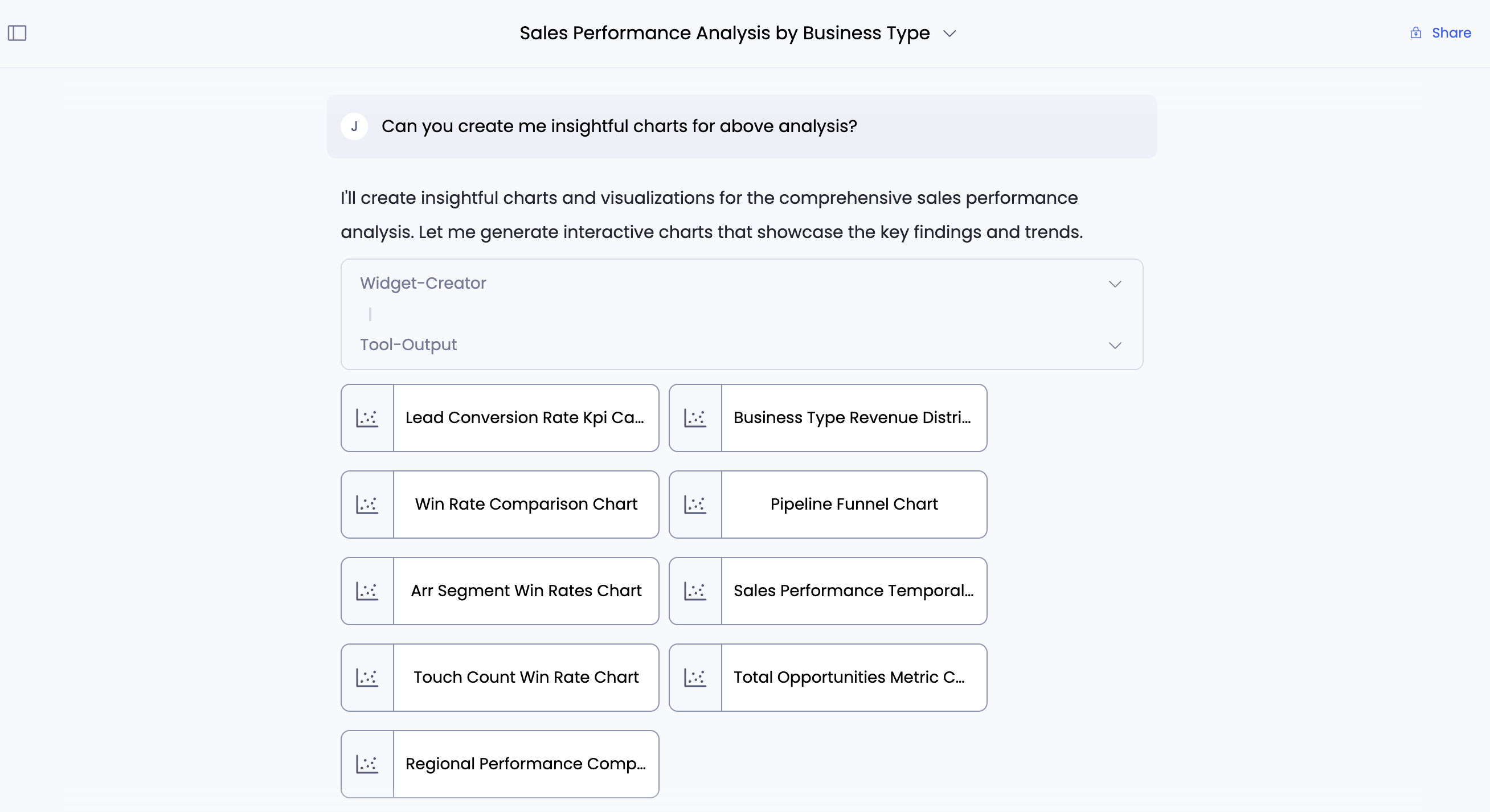 Suppose you want a comprehensive sales performance analysis covering trends, segment breakdowns, pipeline conversion, touch-to-win correlations, and geography. You prompt Petavue with that multi-part question.