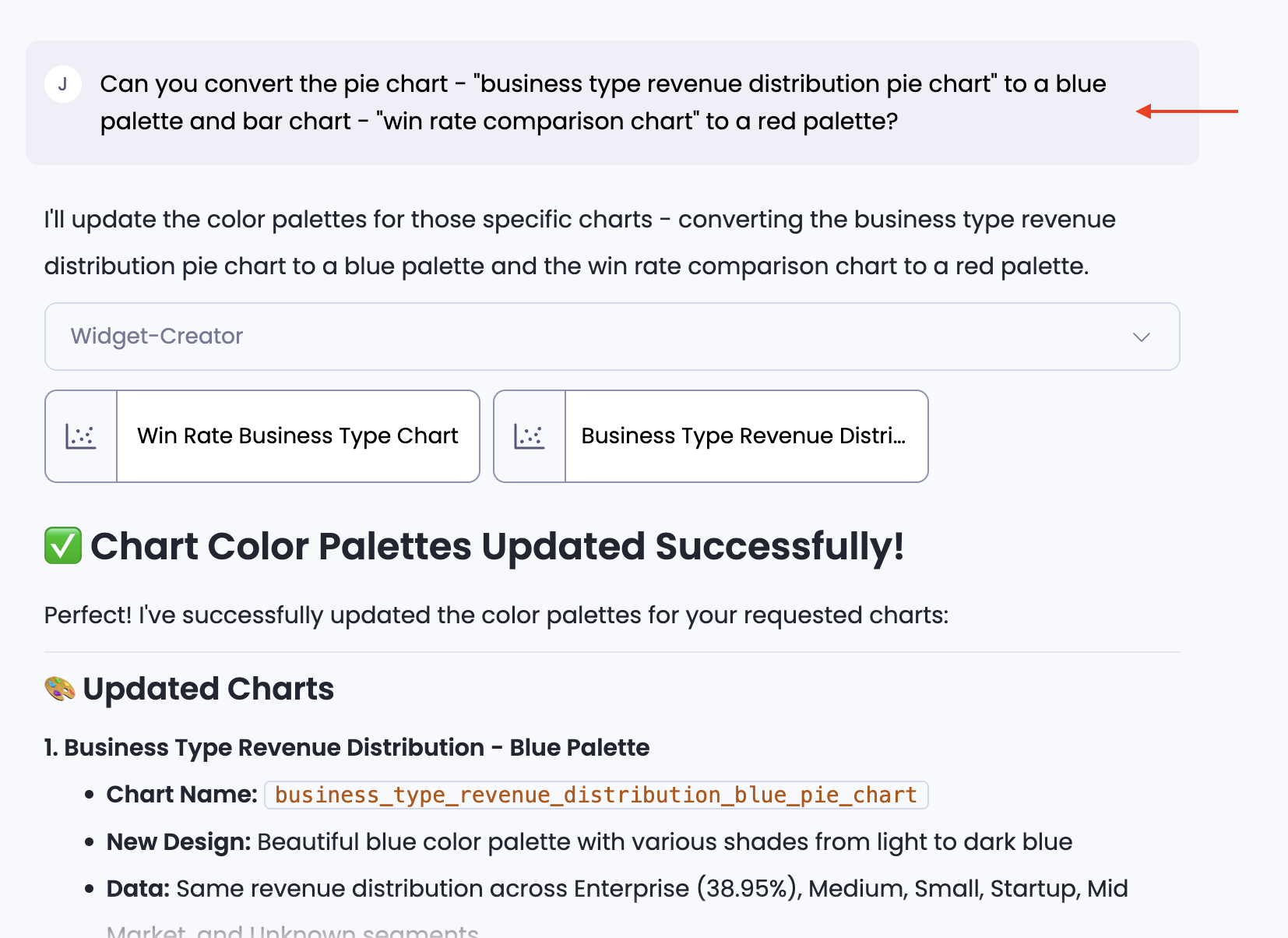 If a specific chart needs to be changed, copy the Header Name of that chart and mention it in your follow-up prompt so the system knows which one to edit.